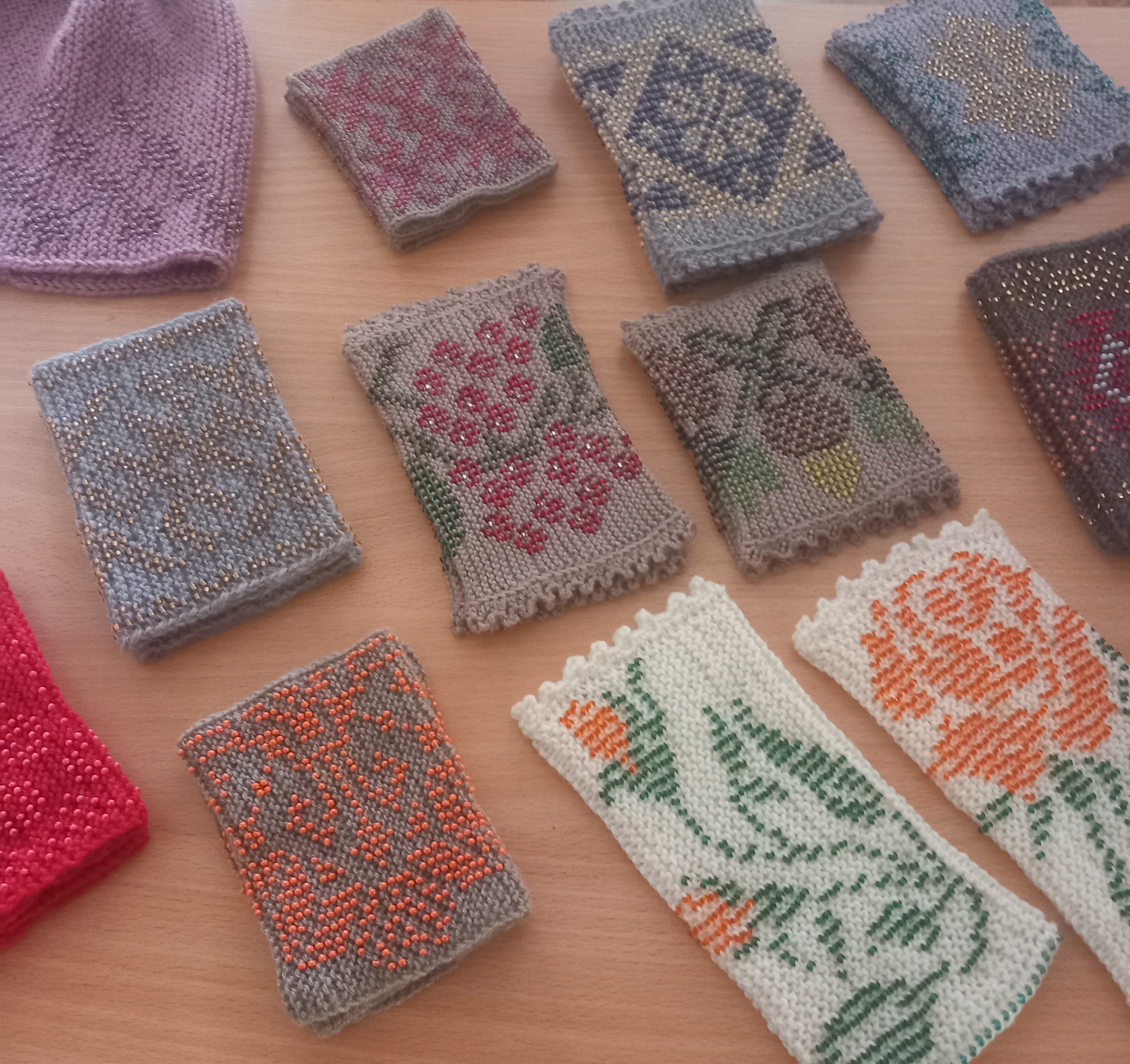 Izstādē aplūkojami rūpīgi adīti cimdi un mauči ar pērļotiem rakstiem.