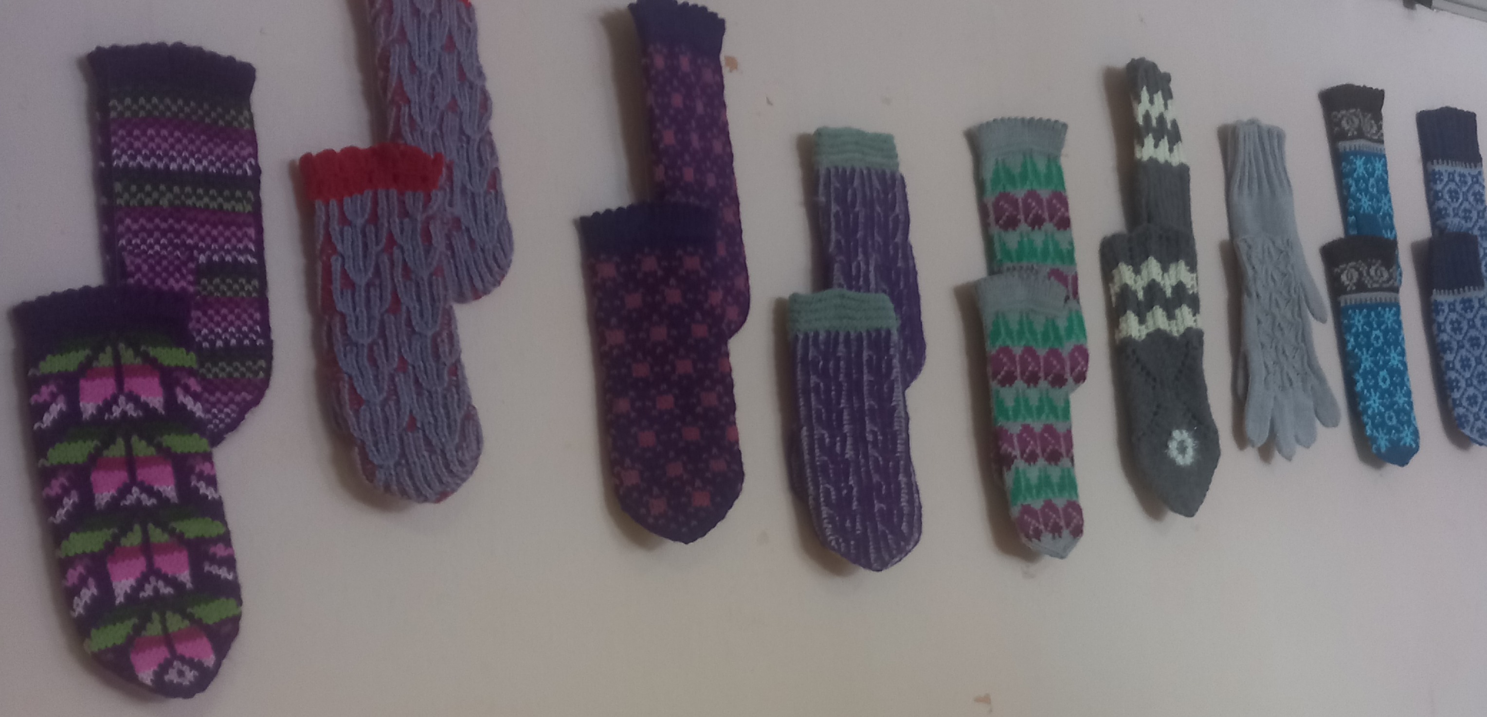 Izstādē aplūkojami rūpīgi adīti cimdi un mauči ar pērļotiem rakstiem.