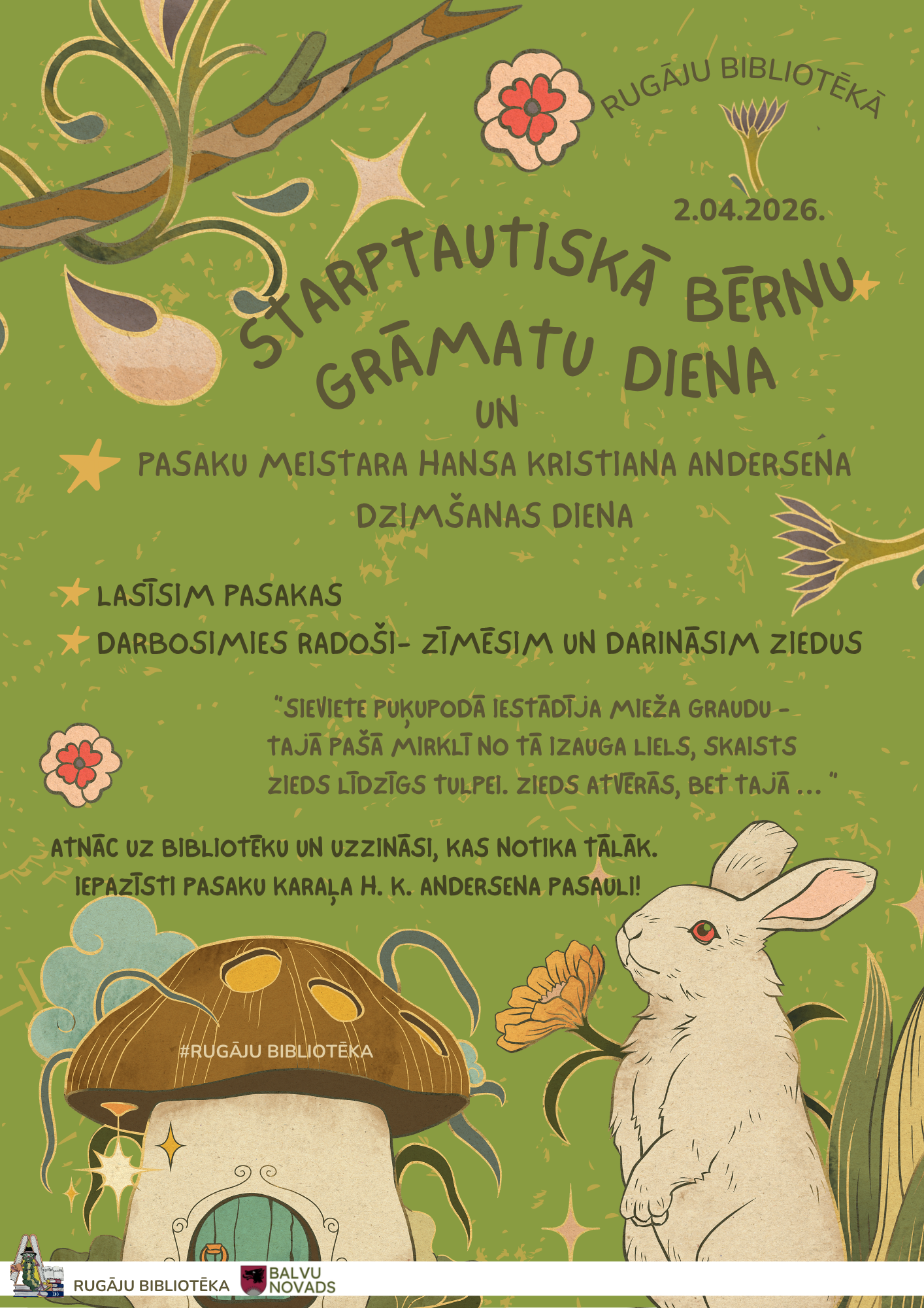“Dēstiet stāstus un pasaule uzplauks” – ar šādu saukli Starptautiskā bērnu un jaunatnes literatūras padome (International Board on Books for Young People, IBBY) aicina sagaidīt 2026. gada 2. aprīli, pasaku meistara Hansa Kristiana Andersena dzimšanas un Starptautisko bērnu grāmatu dienu. Jau kopš 1967. gada 2. aprīli visā pasaulē velta īpaši bērnu grāmatu lasīšanai, bērnu grāmatu autoriem un ilustratoriem, tā godinot tos, kas grāmatas rada, un tos, kas gatavi tajās pazust un atkal atrasties.